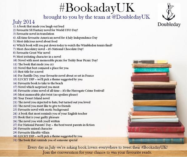 So this month, the #BookadayUK baton has been handed from Borough Press to Doubleday, and as I was so rubbish at keeping up with last month’s hashtag, I have decided on a Sunday to do a little round-up of the week’s topics.
